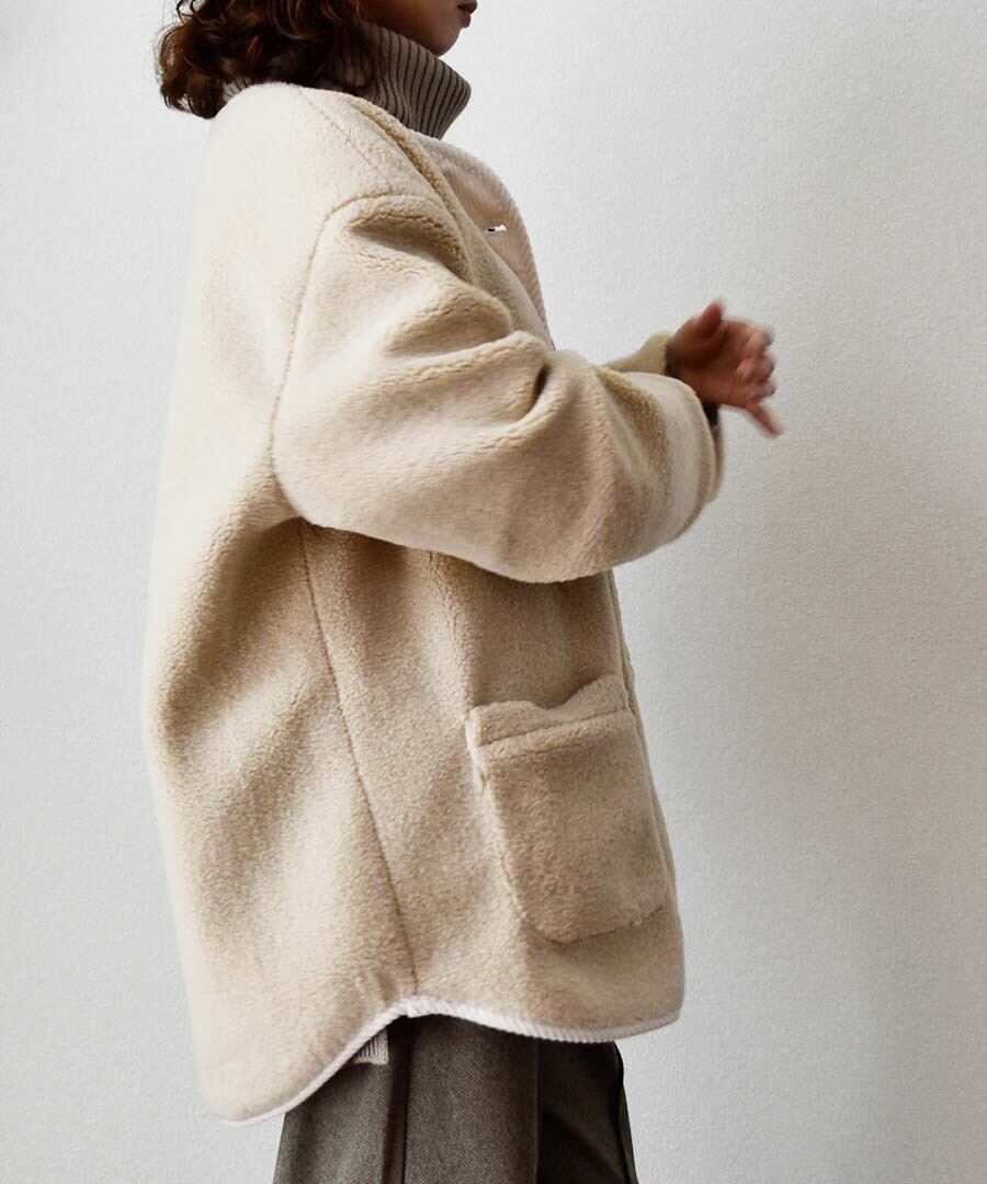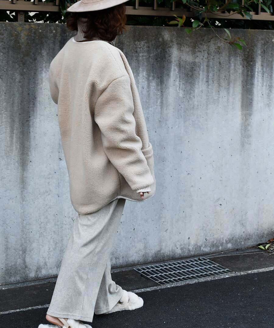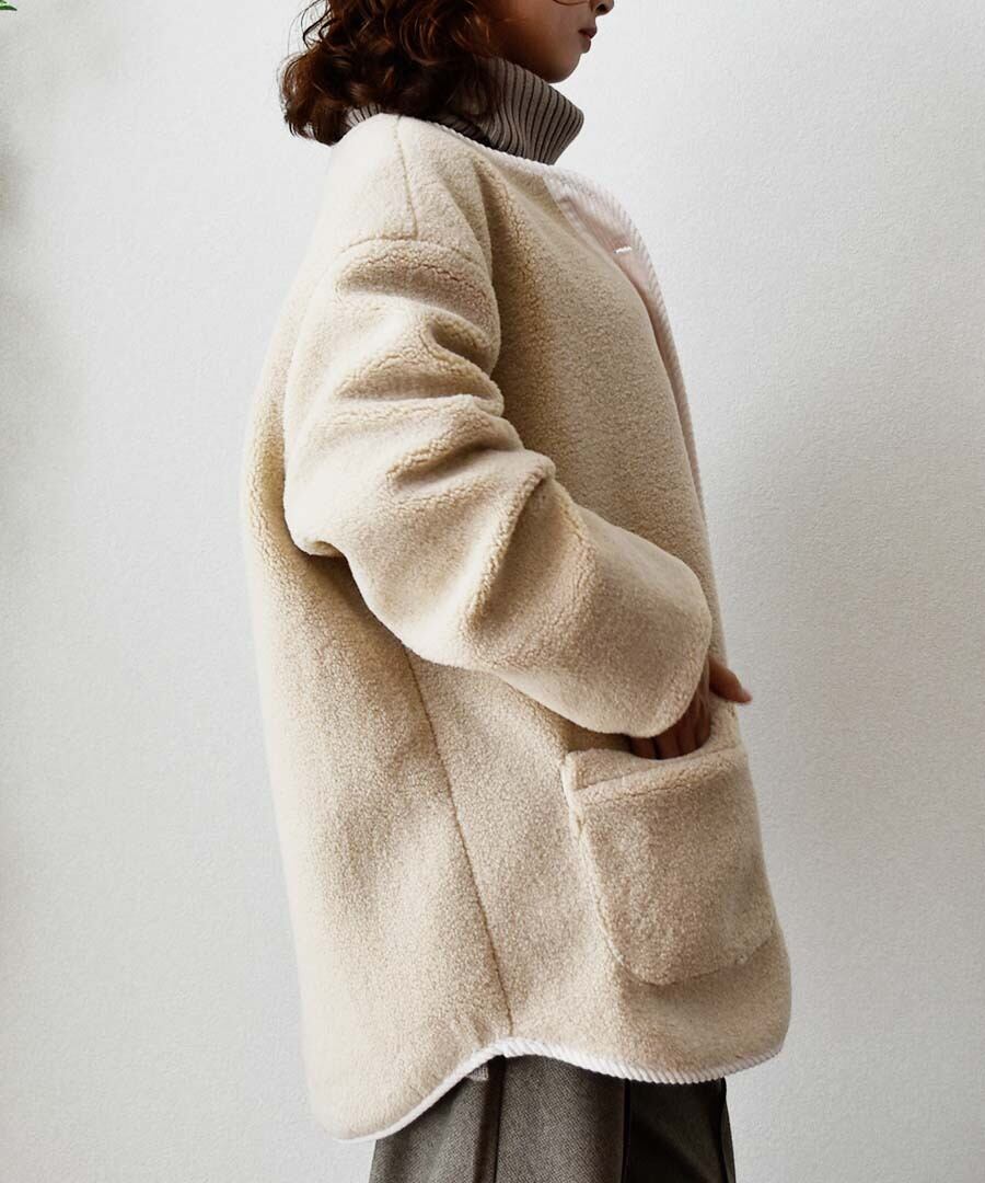 もこもこのボアジャケットはパイピング部分がコーデュロイ生地の ボア×コーデュロイで今の気分を欲張った1枚。