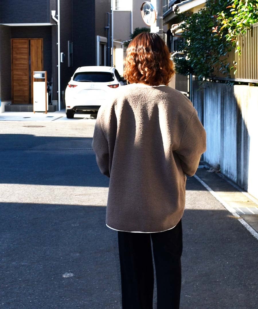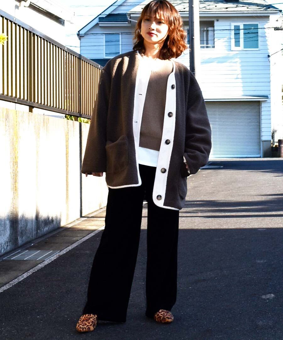 もこもこのボアジャケットはパイピング部分がコーデュロイ生地の ボア×コーデュロイで今の気分を欲張った1枚。