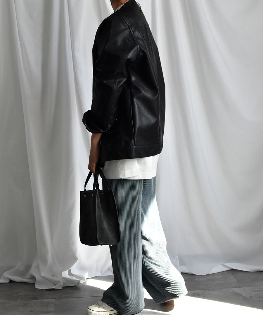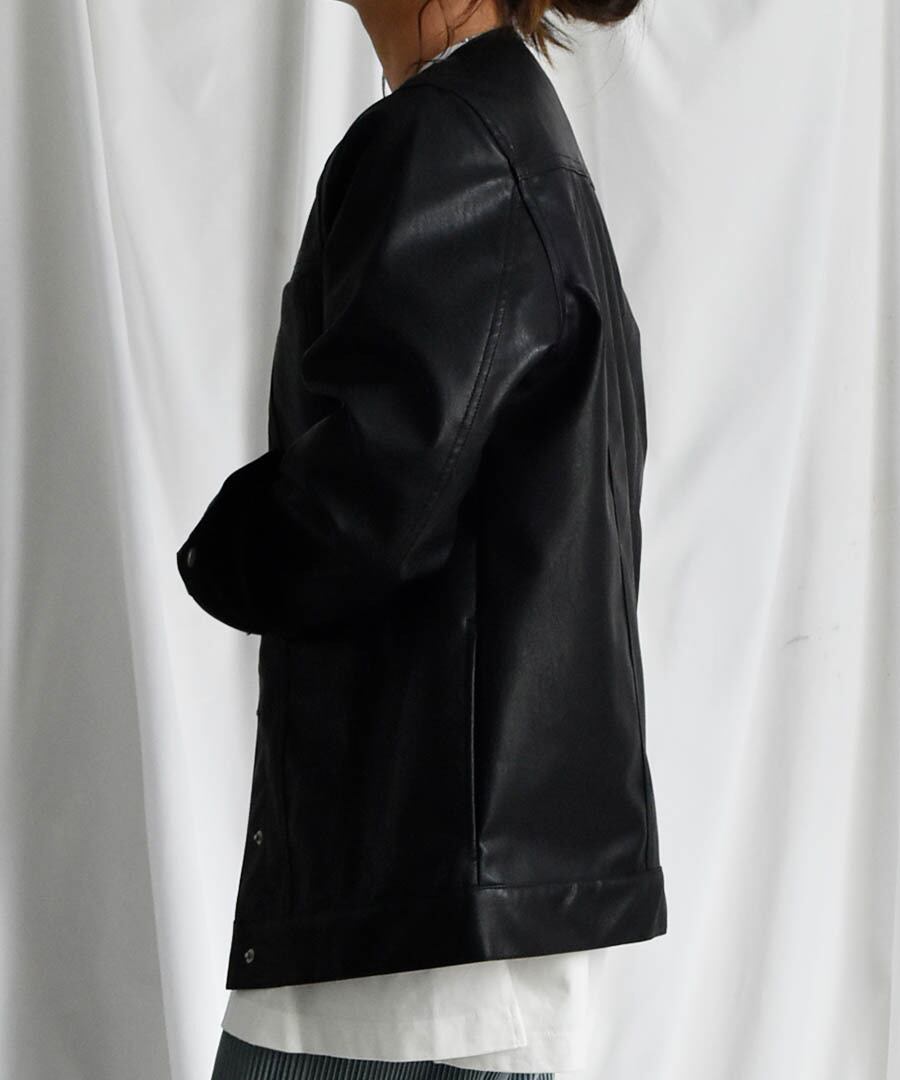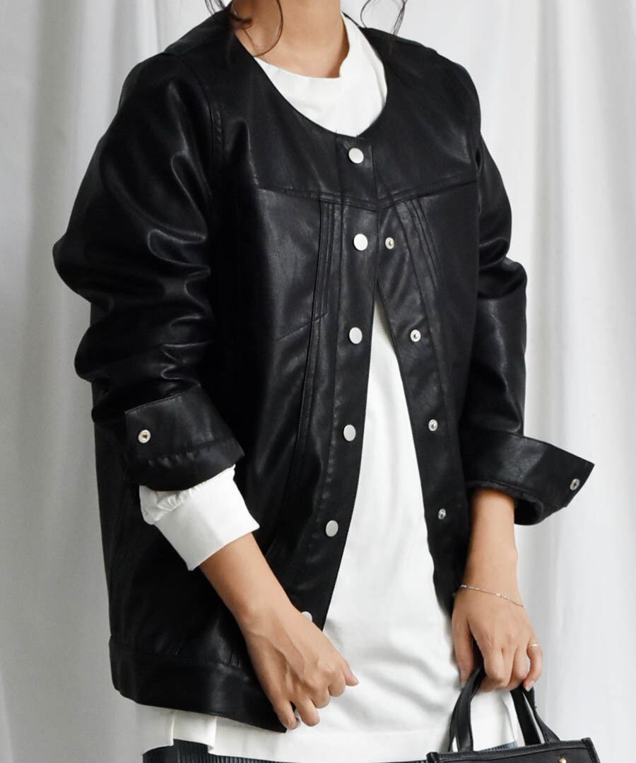 サイズ感抜群のノーカラーオーバーサイズフェイクレザージャケットが新登場!独特の光沢感がありながらもフェイク素材を使っているので、エコにも貢献できます。